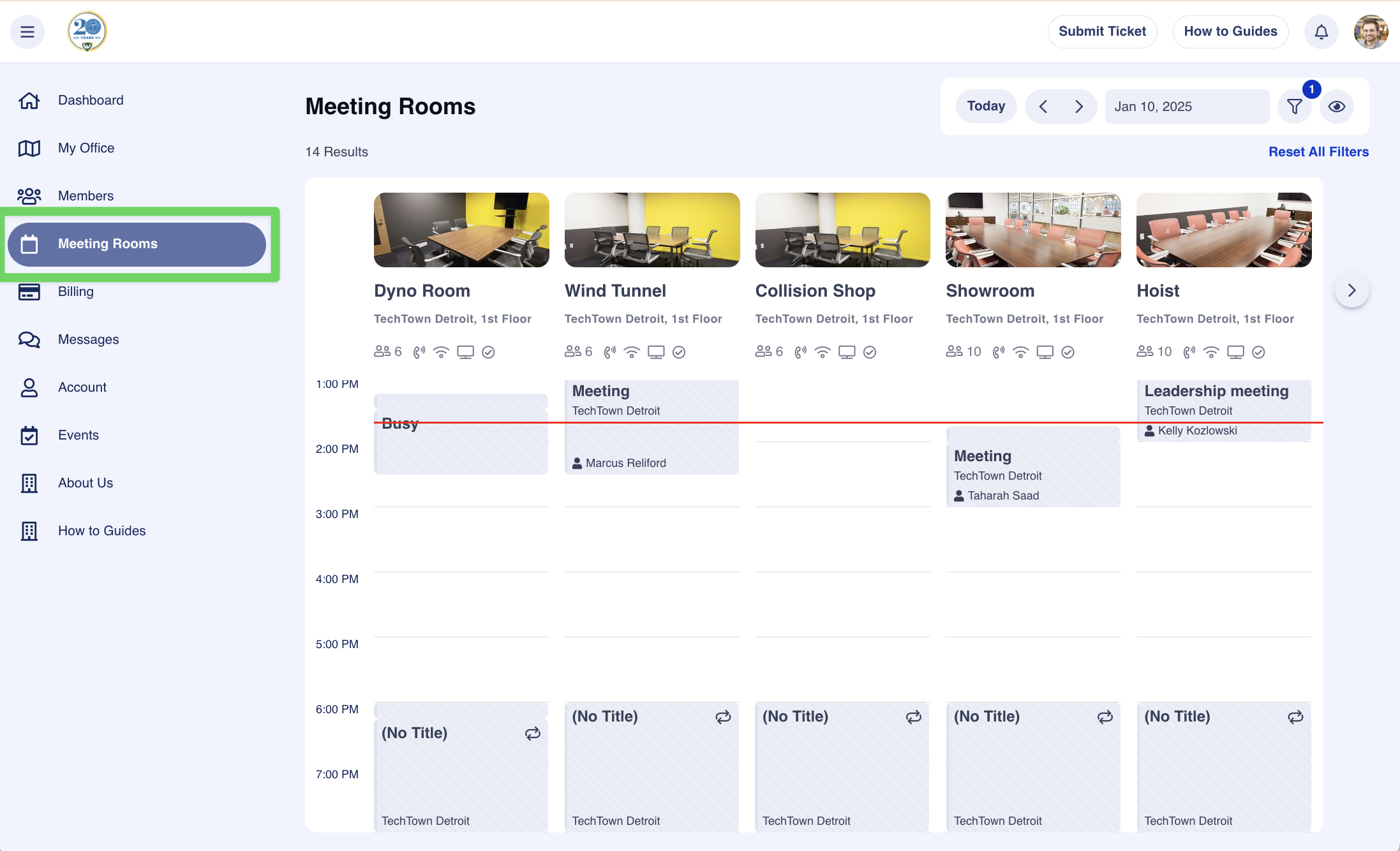 You can find the Meeting Room calendar module on the right-hand menu of our portal (See the image below, with menu options highlighted in green). Here, you can find the availability for all of our rooms at TechTown, including the availability for our