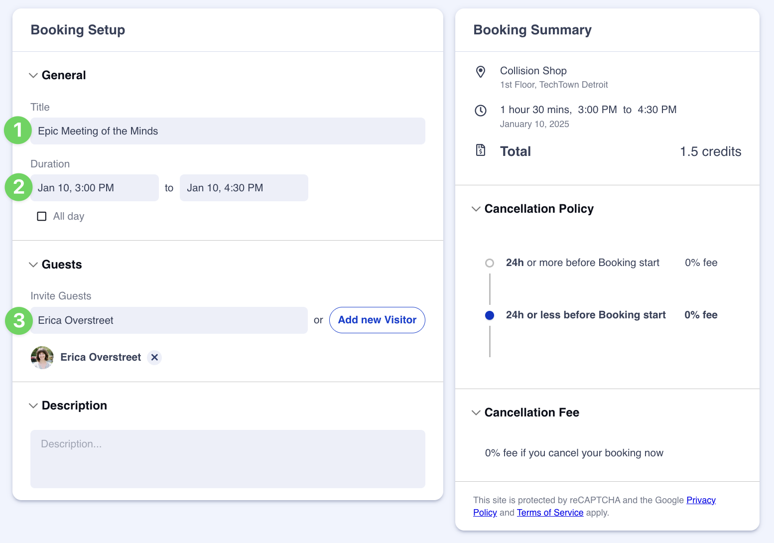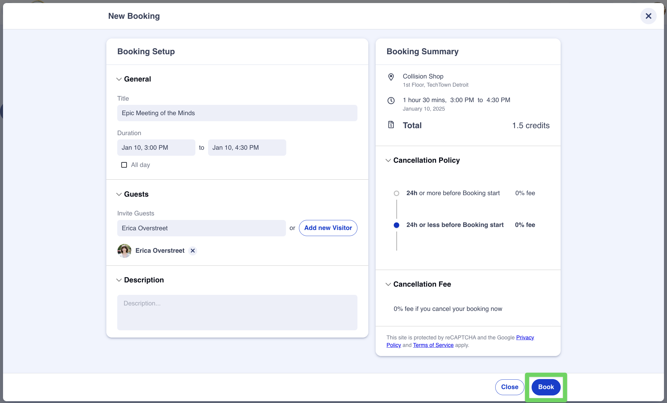 On this page, you'll finish entering any other relevant details for your booking. You'll need to add a title for the booking (like "Company Team Meeting"), add an end time, and add any fellow colleagues or visitors associated to your booking. On the right hand of the page, you'll see how many credits the booking will use from your balance, and if you have used all of your credits with previous bookings, you'll see any associated charges with your booking.
