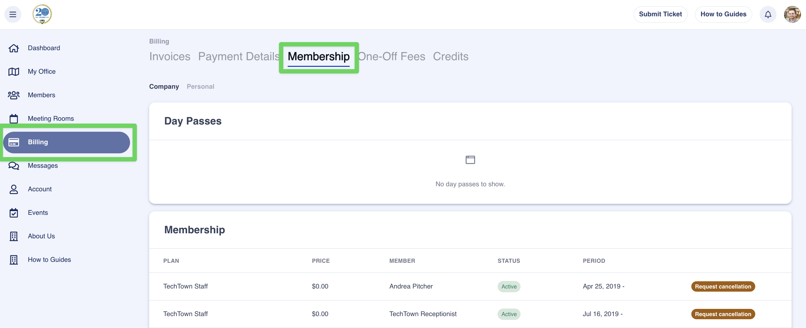 Step 2: Find the membership from the membership list below and click on the "Request Cancelation" to the right of the membership.