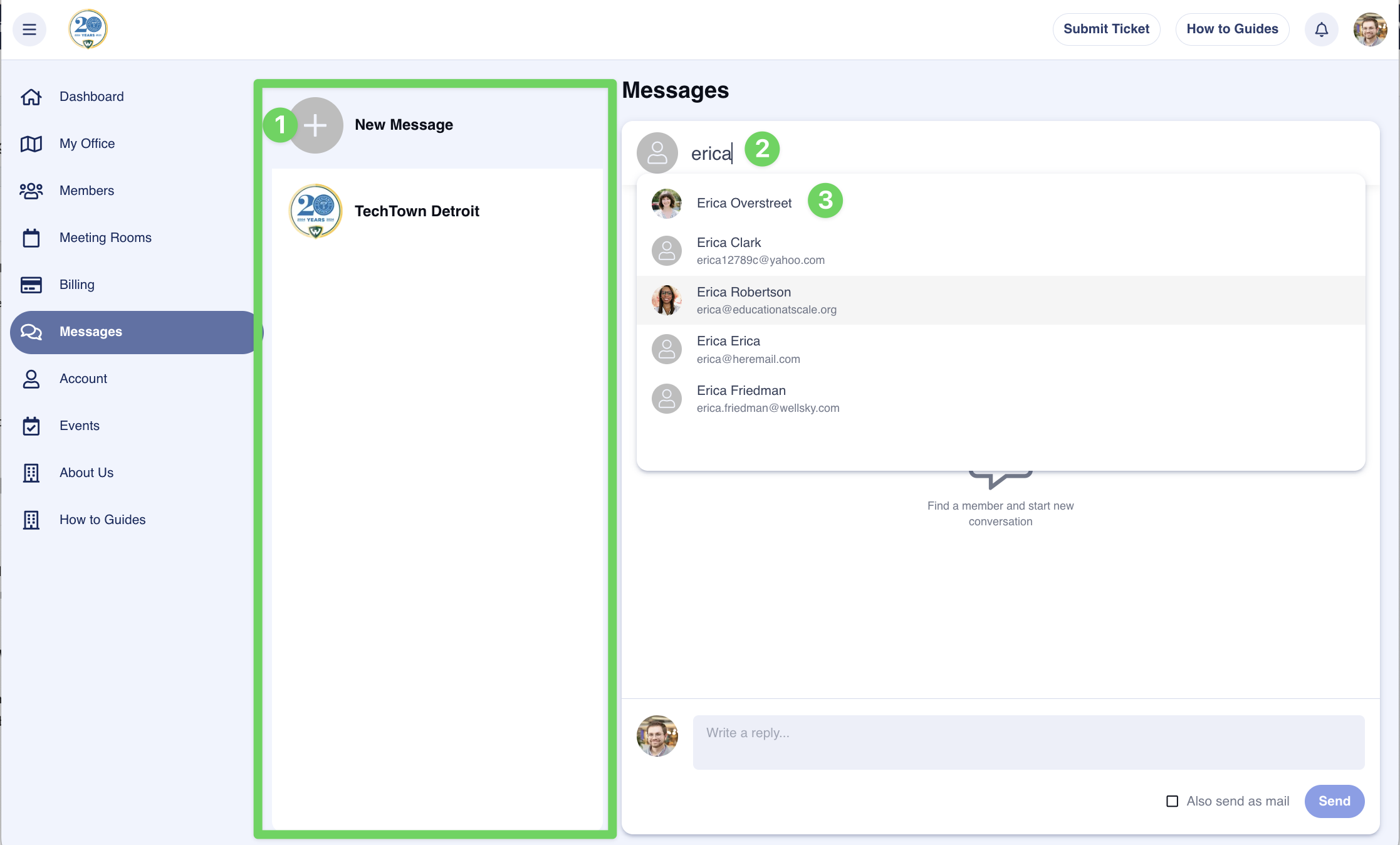 When you click on "New Message," the window to the right will show just below the 'Messages' heading, and a search bar labeled 'Search for Member" will appear. Click within that search bar and enter the name of the individual you'd like to talk with. Click on the member from the search results to continue.