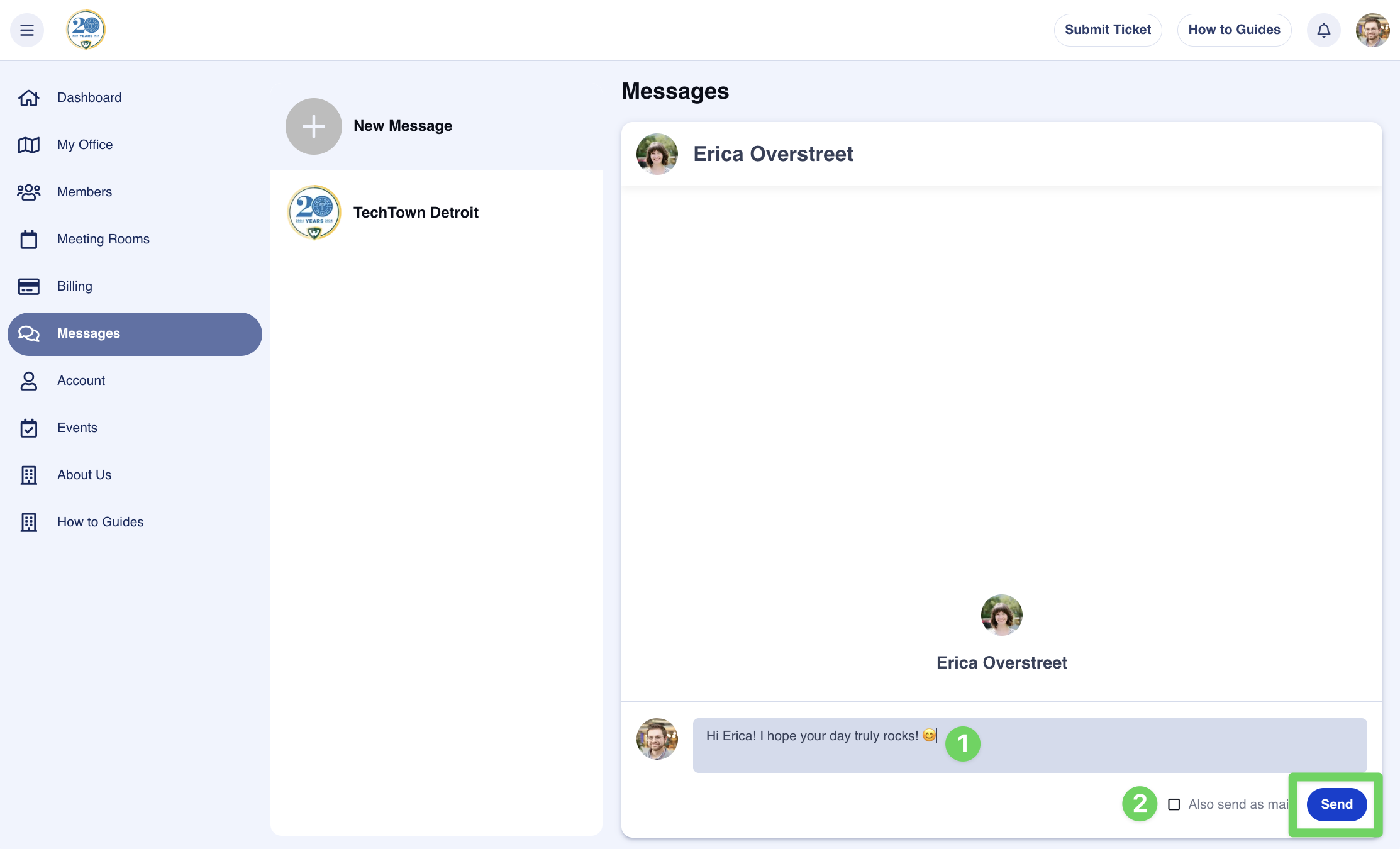 Begin crafting your message and add any text or emojis you wish! You can also send your message as an email if you want to catch the ember's attention outside of the members portal by checking the 'Also send as mail' Once your message is ready, click on the blue send button.
